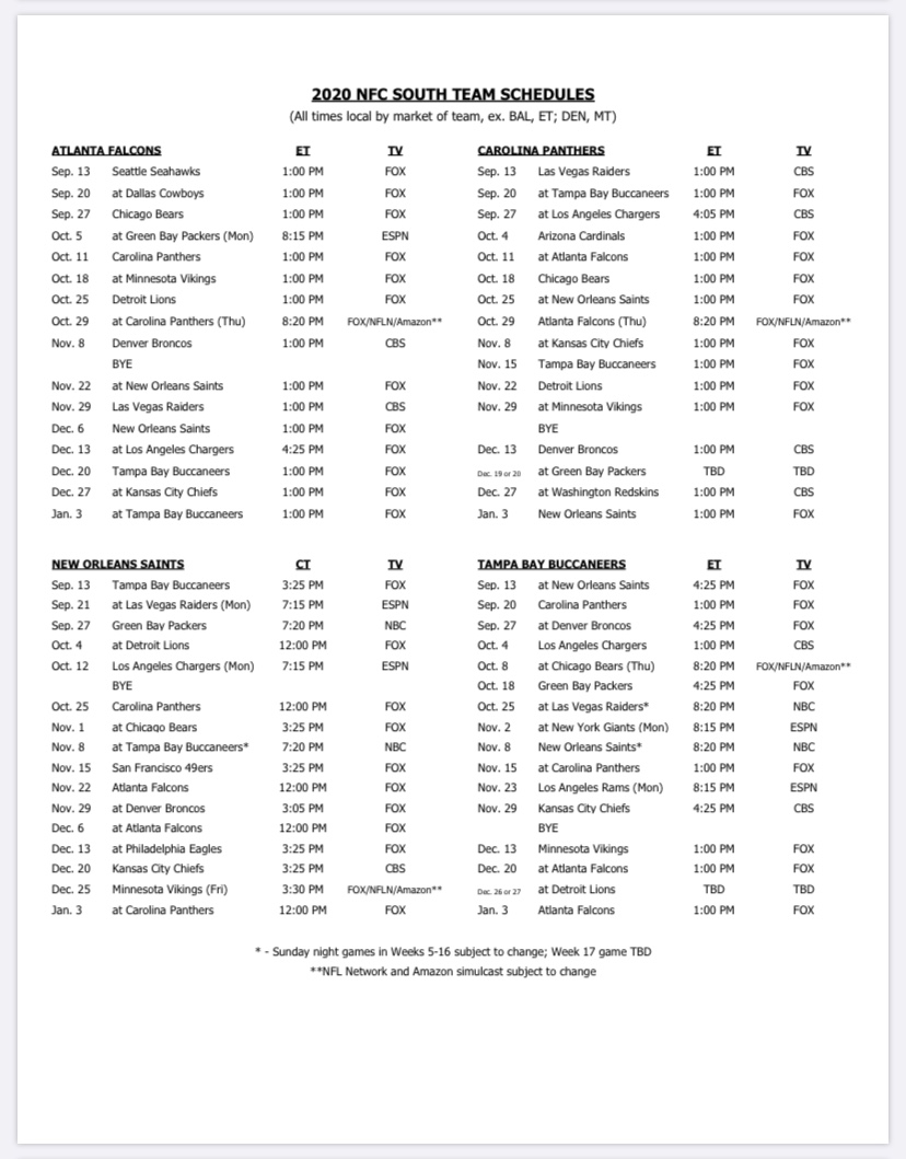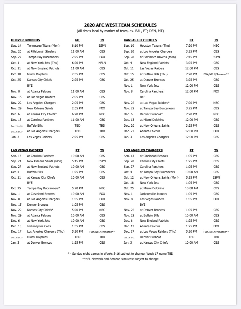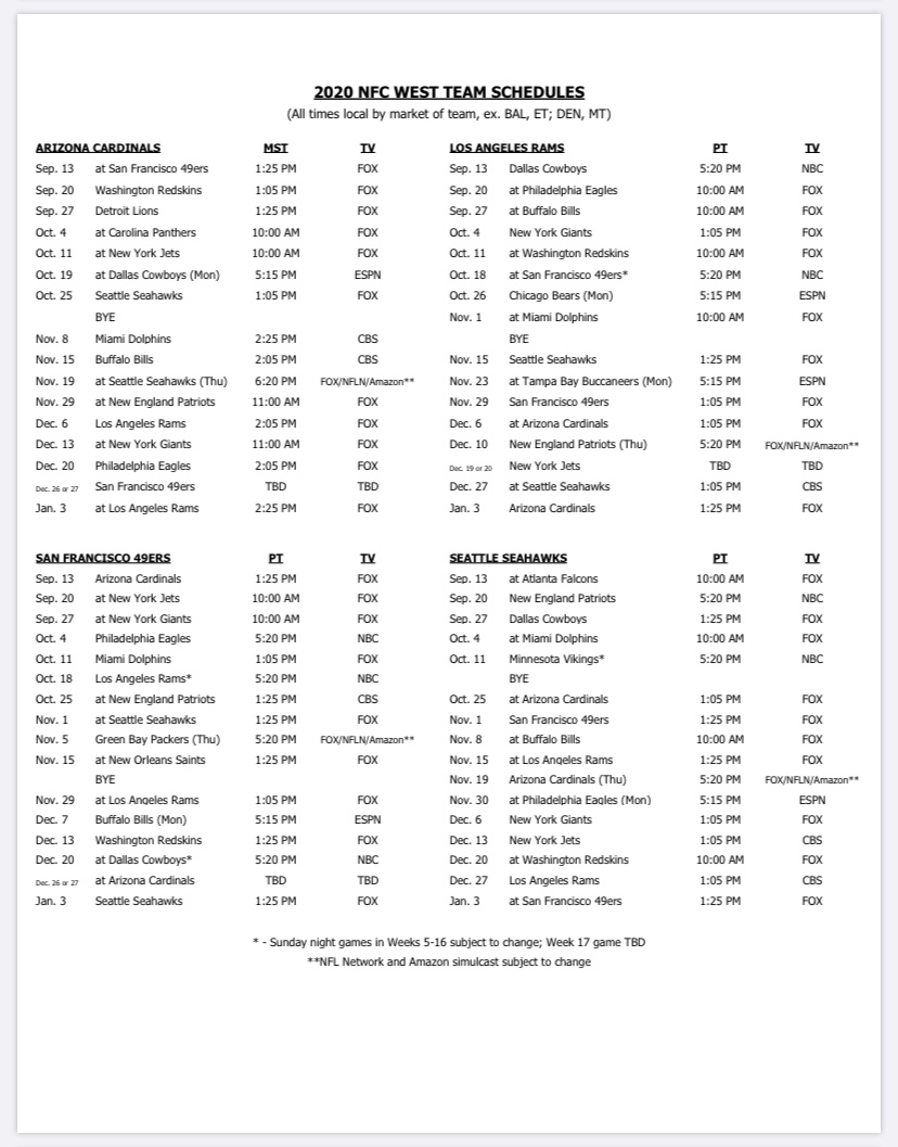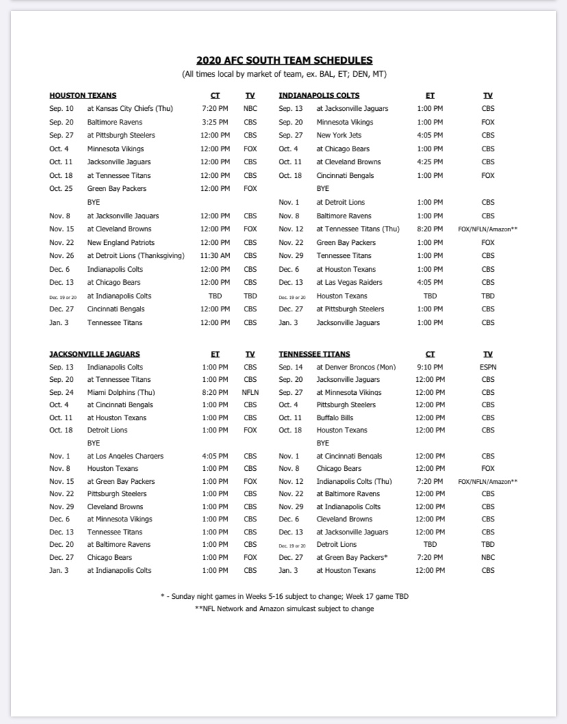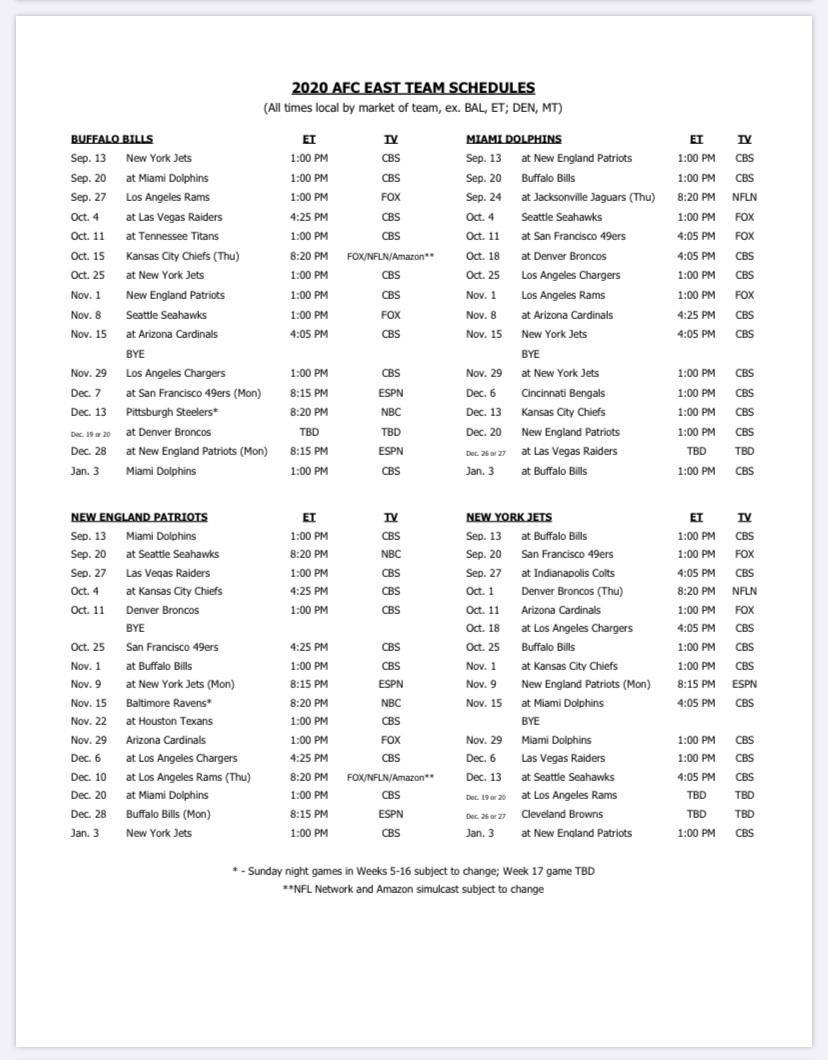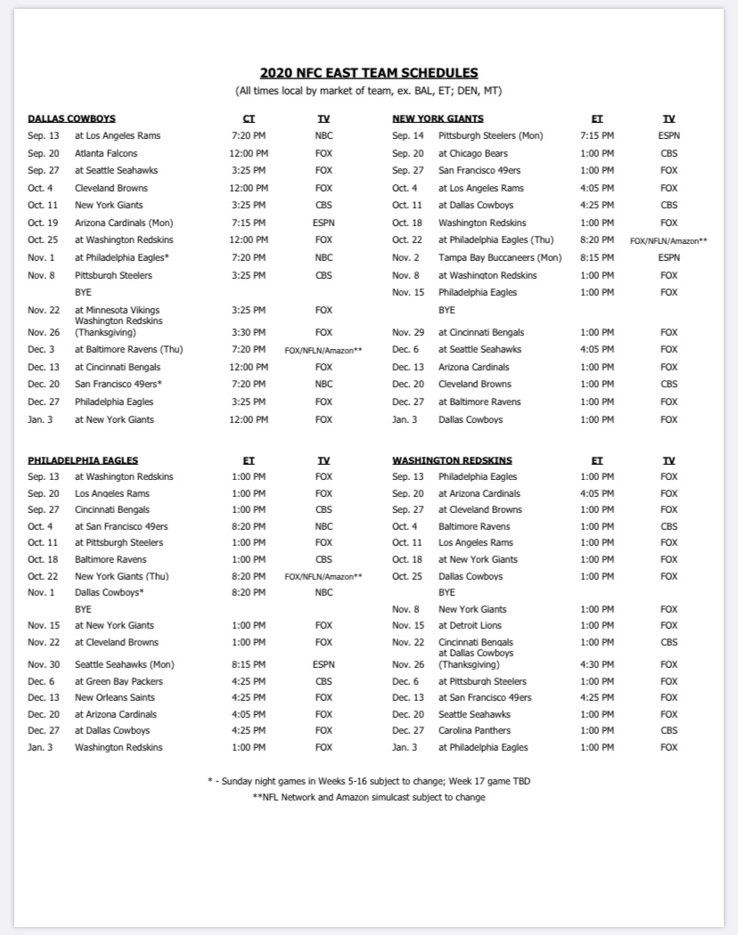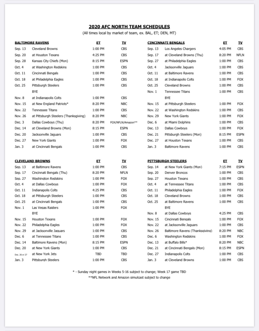 The NFL released its 2020 17-week full schedule and here are some quick notes while perusing the date and times below: