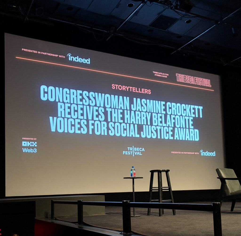 On June 13, 2025, Congresswoman Jasmine Crockett received the Harry Belafonte Voices for Social Justice Award—presented by Whoopi Goldberg at the Tribeca Film Festival.