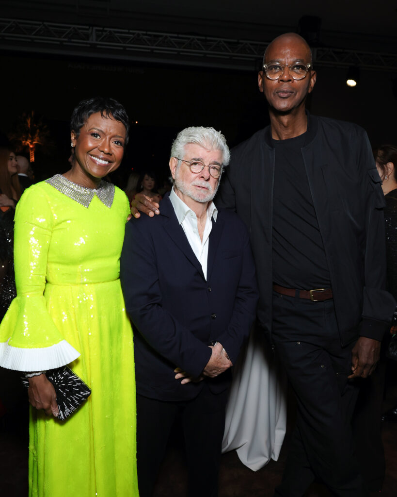 LOS ANGELES, CALIFORNIA – NOVEMBER 01: (L-R) LACMA Trustee Mellody Hobson, LACMA Trustee George Lucas, and Mark Bradford attend the 2025 LACMA Art+Film Gala, Presented By Gucci at Los Angeles County Museum of Art on November 01, 2025 in Los Angeles, California. (Photo by Stefanie Keenan/Getty Images for LACMA)