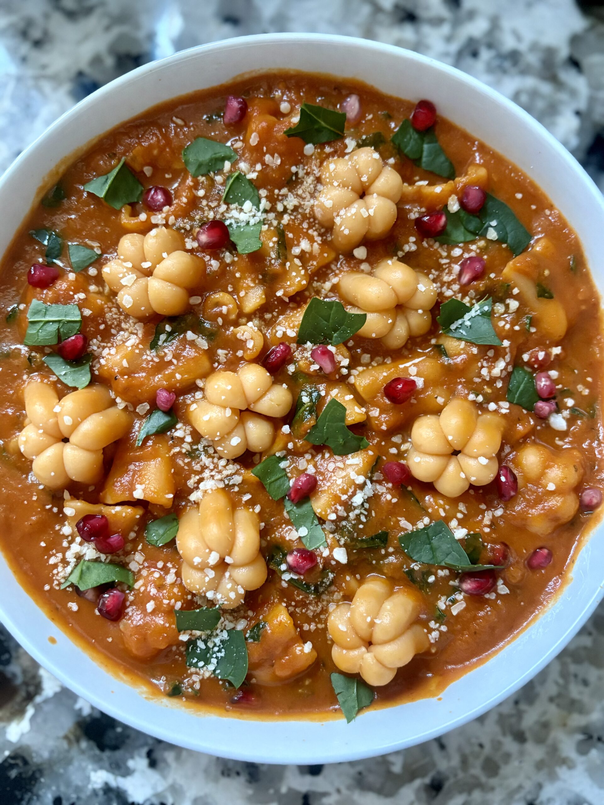 I did not boil the entire bag of pasta for this dish due to its expansion once the pasta is ready in Al dente form. I used the whole bottle of creamy pasta and added one to two tablespoons of the organic roasted red pepper and almond pesto sauce for a nice simmer. Then I added a teaspoon of minced garlic plus some minced onion. Fresh spinach is added and utilized for my greenery. The pomegranate seeds are a significant health benefit bonus that adds a slight sweet/tartness to the meal.
